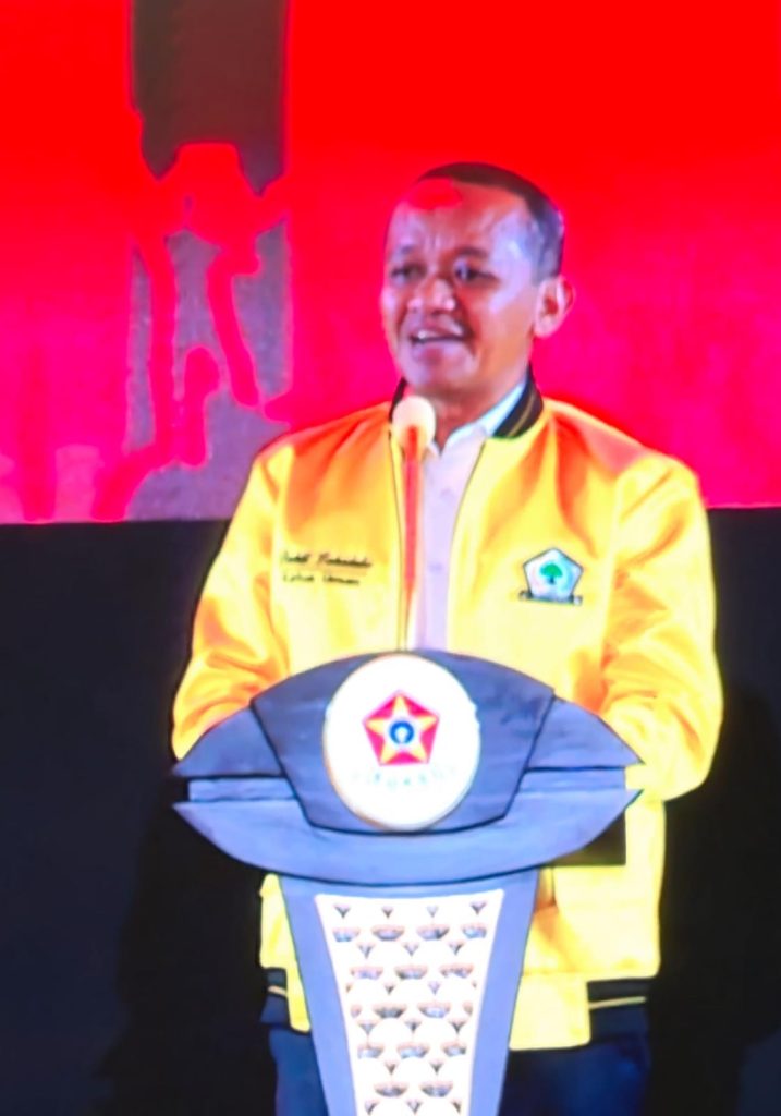 Tampak Ketua Umum Golkar Bahlil Lahadalia sedang memberikan Pidato atau Sambutan dalam Pembukaan Musyawarah Nasional SOKSI.